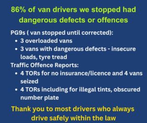 - Three further vehicles were prohibited due to insecure loads or dangerous defects such as tyres with insufficient tread.